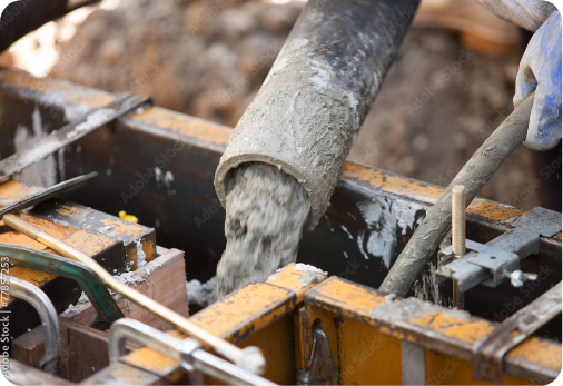 生コンクリート(固まる前のコンクリート)を型枠の中に流し込み、 建物の基礎を作る工事です。 適切な施工管理で、安全で品質の良いコンクリートを打設致します。