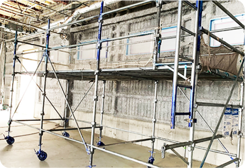 ローリングタワーは高いところの作業に使用する仮設移動式の足場です。高所での作業を安全に行えるよう、適正な強度と安定性を保つことができるように組立て、安全かつスムーズに移動が行えるように施工します。