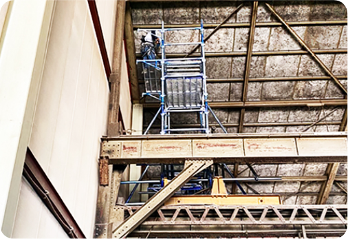 ガータークレーン足場とは、工場などの天井にあるガータークレーンの上に組む足場です。移動式のクレーンの上に足場を組立てるので、一度足場を組んでしまえばクレーンを移動しながら作業が行えることが特徴です。